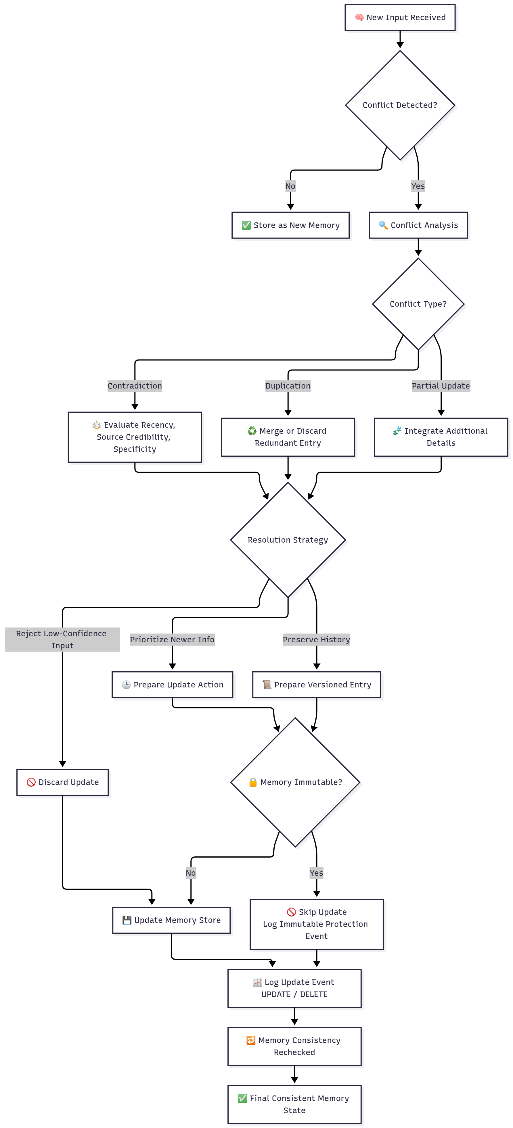 - Conflict Resolution (Xử lý mâu thuẫn): Mem0 so sánh memory mới với dữ liệu đã có nhằm phát hiện trùng lặp hoặc mâu thuẫn, sau đó cập nhật hoặc ghi đè khi cần thiết.